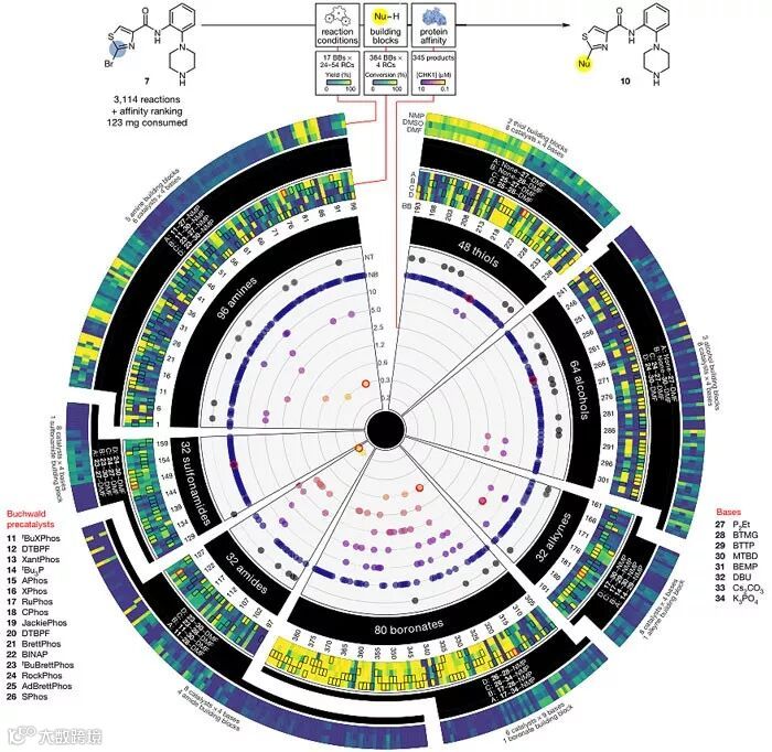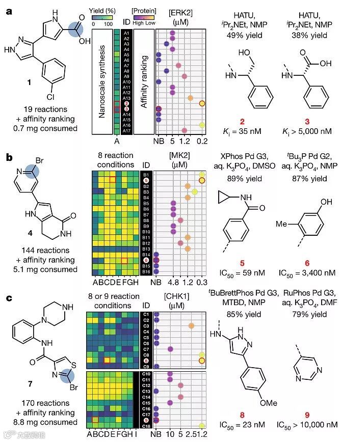NanoSAR技术高通量筛选CHK1抑制剂及其合成条件。图片来源:Nature