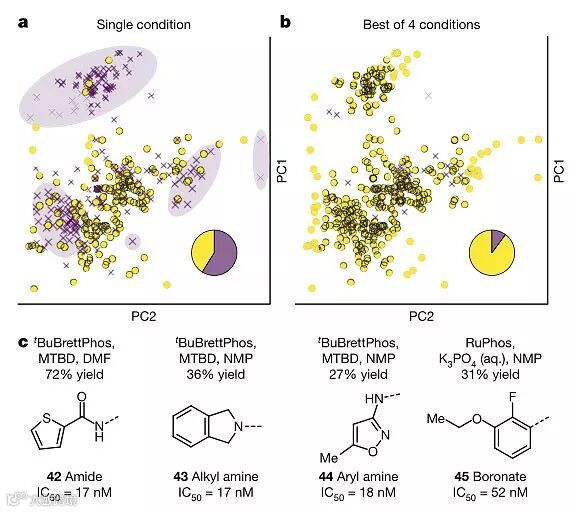 利用NanoSAR技术,实验人员无需分离产物,快速地进行了3114个偶联反应,仅仅消耗了123 mg的原料(7),就筛选了多个反应条件组合和384种不同的合成砌块,得到了345种候选产物及其合成条件(下图b,黄圈代表反应成功,紫叉代表反应失败),并且得到了产物与靶标蛋白的亲和性排序。相比之下,按照常规方法筛选384种不同的合成砌块,仅仅获得了158种可检测的产物(下图a),比NanoSAR技术少187种,而且优化的合成条件也没有拿到,差距显而易见。在常规方法无法触及的187种产物中,NanoSAR技术预测其中21种是潜在的活性化合物并且给出了合成条件。后续的合成、纯化和生物活性测试结果也验证了这一点——这21种化合物中,有一些(例如化合物42–45)抑制CHK1的IC50在nM量级,活性很高(下图c)。也就是说,常规方法无法发现的潜在药物小分子,在NanoSAR技术里就不会被埋没。