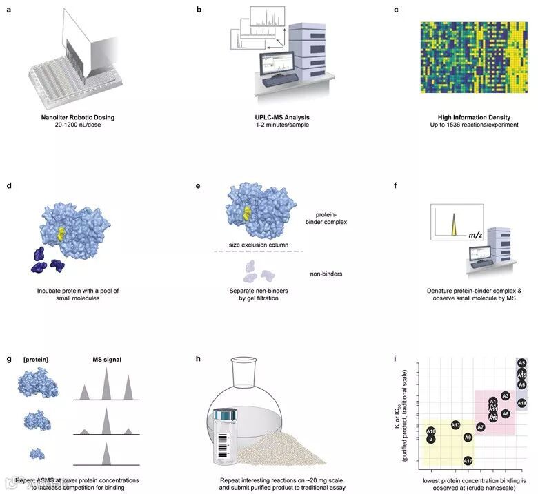 将化学合成与生物活性测试结合起来不算是新想法。不过,当前的大多数策略中,要么生物活性测试不支持高通量的偶联反应,要么需要在生物活性测试之前对高通量偶联合成的产物进行纯化、预处理等复杂耗时的操作。NanoSAR技术最重要的突破,就是对高通量纳摩尔量级偶联反应完成后的产物混合物进行直接的亲和性筛选。如下图所示,NanoSAR技术第一步(a-c),通过自动化高通量反应平台对大量底物的组合及反应条件进行筛选,并通过超高效液相色谱-质谱联用装置在线检测每个偶联反应的产物及产率。第二步(d-g),将所有生成的小分子产物混合并与体外纯化的靶标蛋白进行孵育反应,通过体积排阻色谱柱(size exclusion column)分离出小分子产物(作为配体)与靶标蛋白结合的复合物,分离出的复合物再经变性解离以释放小分子配体,然后对这些小分子配体再进行质谱分析便可获得其结构信息。需要指出的是,当靶标蛋白含量逐渐降低时,混合物中小分子配体之间将会产生竞争,亲和性高的小分子将优先与靶标蛋白结合。通过这种方法,对比不同浓度靶标蛋白与小分子配体作用后的质谱结果的变化,便可以间接辨别不同亲和性的小分子配体并对其亲和性进行排序。第三步(h, i),根据亲和性排序选择目标分子,按照最佳的反应条件对目标分子进行毫克量级的制备和纯化,然后进行常规生物活性测试,如对靶标蛋白的抑制活性Ki或IC50。
