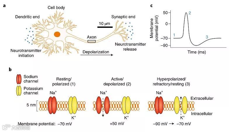 图1. 受到刺激之后神经细胞轴突膜内电位的变化。图片来源:Nat. Nanotech.