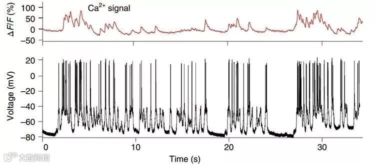图2. 基于检测Ca2+的光学法表征细胞活动的响应时间(上)和膜片钳电极法表征细胞活动的响应时间(下)。图片来自:Nat. Nanotech.