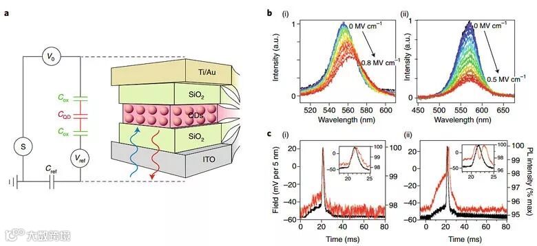 图4. 电场对I型量子点(i)和quasi-type II型量子点(ii)荧光强度的影响。图片来源:Nat. Nanotech.