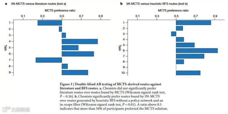 毫无疑问,3N-MCTS算法在逆合成分析的速度上遥遥领先,那么其提供的分子合成路线的质量又如何呢?随后进行的一项双盲测试(测试执行者与受试者都不知道路线的来源)显示,针对9个相同的目标分子,45名经验丰富的化学家们对于3N-MCTS算法提供的合成路线与文献报道的路线并没有明显的偏向(下图a);而在3N-MCTS和Neural BFS算法设计的路线中,化学家们则明显更倾向于选择前者(下图b)。这表明新AI算法在预测分子合成路线方面已经超过目前的算法,并与人类化学家同样值得信赖。