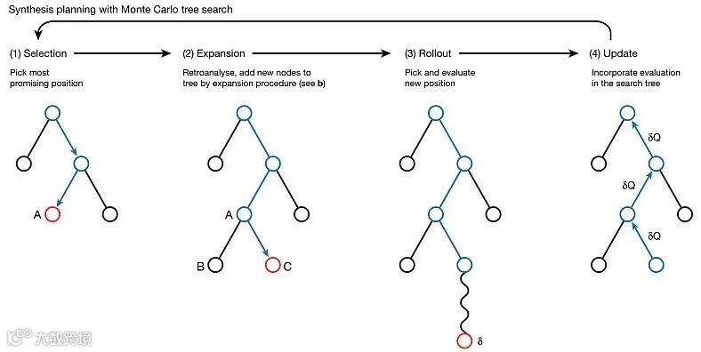 MCTS进行合成路线分析的原理示意图。图片来源:Nature