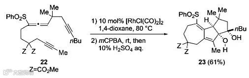 最后,作者还尝试了将底物中高炔丙基联烯基和炔基连接的碳脂肪链长度增加到4个碳。反应从化合物22出发,在标准条件下能以61%的收率得到7/5/5三环化合物23,由此实现了该类反应在多环体系构建中的进一步扩展。