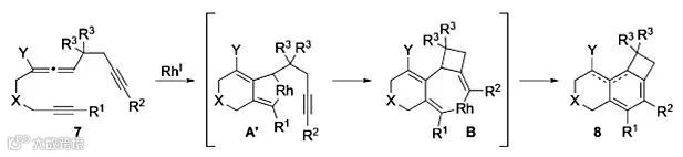 基于反应中得到的中间体A,作者进一步提出了如图2所示的设想,含有高炔丙基联烯-炔的化合物7通过氧化环金属化得到中间体A',然后发生分子内炔烃的插入得到中间体B,最后还原消除得到6/6/4并环化合物8。