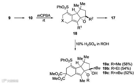 作者还注意到,高炔丙基联烯-炔化合物发生环化反应的产物中含有三个共轭的双键,致使产物较不稳定。因此作者希望对其中的一个双键进行衍生化来破坏这种共轭结构,增加产物的稳定性。含有苯磺酰基联烯基的底物发生环化后再在m-CPBA和稀硫酸的条件下反应,可以得到顺式的双羟基化产物17。对于考察的16种不同的底物,连接基团X可以是包含或者不包含偕二酯基的碳原子,也可以是氮原子或者氧原子。