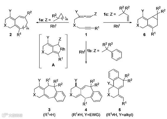 过渡金属催化的环化反应涉及C-H键及C-C键的活化,成为构建复杂环系结构直接有效的方法之一。日本金泽大学(Kanazawa University)的Chisato Mukai教授课题组近年来致力于Rh催化联烯参与的环化异构化反应。他们早期报道了Rh(I)催化联烯-炔参与的环化过程。该反应从化合物1出发,首先发生氧化环金属化得到重要的铑杂[4.3.0]中间体A,联烯上不同的取代基Z可引导发生不同的C-C键或者C-H键活化,进而得到不同的环系化合物2-6。