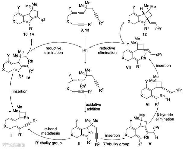 根据以上实验结果,作者提出了可能的反应机理,底物9或者13先和Rh(I)催化剂络合得到I,随后氧化环金属化得到重要中间体,当R1位阻较小时,反应发生σ键复分解得到中间体,III再对炔烃插入得到IV,最后还原消除得到6/5/5并环化合物10或者14;当R1为大位阻的取代基时,II对炔烃插入得到中间体V,β-H消除得到联烯化合物VI,VI进一步发生插入反应、还原消除得到6/5/4并环化合物12。