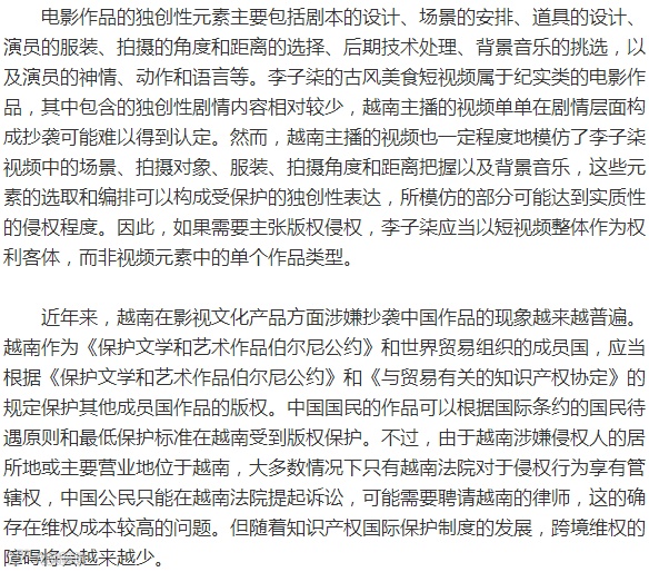 近期,关于越南博主涉嫌抄袭李子柒的古风美食短视频事件侵权引起社会舆论的关注。“抄袭李子柒事件”的争议焦点在于影视作品的抄袭认定问题,这涉及到著作权法保护表达而不垄断思想的基本原则。由于“思想表达二分法”的界限没有简单统一的适用标准,影视作品的模仿行为能否被认定为侵害版权容易产生争议。