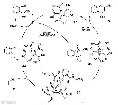 作者综合实验研究和理论计算提出了如图5的反应机理,催化剂17与水杨醛缩二乙醇作用消除一分子乙醇得到羰基氧鎓离子,接着与2通过34的过渡态模式进行Diels-Alder反应得到35,35又进行质子回返得到产物并重生催化剂。