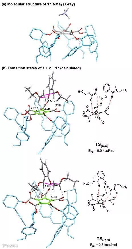 为了对催化剂17的结构进行深入的了解,作者对催化剂17的四甲基铵盐进行单晶培养,从而确定了其相对和绝对构型。顺利获得催化剂17的结构后,作者对反应的过渡态进行了理论计算研究,反应经历Ts(S,S)过渡态时能量最低。