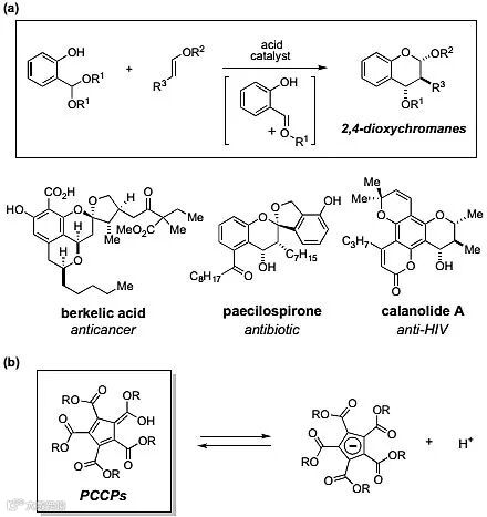 含氧色满结构是很多天然产物和生物活性分子的核心骨架,因而引起全球众多化学家的广泛关注。合成该类结构最简洁有效的策略是水杨醛缩醛和烯基醚通过反电子需求的Diels-Alder反应来实现。理论上讲,手性的Brønsted酸催化剂可使缩醛底物离子化形成活化的羰基氧鎓离子,接着与烯基醚进行立体选择性控制的环加成反应,从而得到手性的2,4-二氧代色满类产物。二芳基甲醇或类似物发生离子化形成的甲基邻苯醌中间体也可以通过不对称的环加成反应得到目标产物。然而,反应中形成氧鎓离子中间体的立体构型需要进行精确调控,由此成为不对称催化反应研究中的挑战。