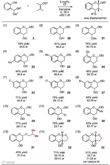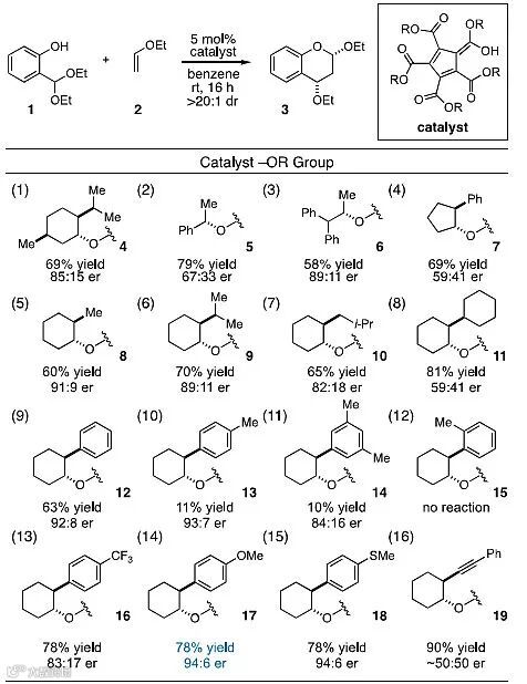 作者首先选择水杨醛缩二乙醇1和乙烯基乙醚2作为模板底物对反应条件进行筛选,主要考察羧酸酯的不同手性醇对反应结果的影响。当使用5 mol%手性薄荷醇衍生的PCCP作为催化剂,反应能以69%的产率和85/15的er值得到产物3。作者接着对其他手性醇进行了考察,当使用手性的反式2-甲基环己醇衍生的8作为催化剂时,产物的er值可提高到91/9。作者固定手性的反式2-取代环己醇骨架,对2位的取代基进行了详细的筛选,最终发现2位的取代基为4-甲氧基苯基时,反应取得了最佳的结果,以78%的产率和94/6的er值得到产物3。