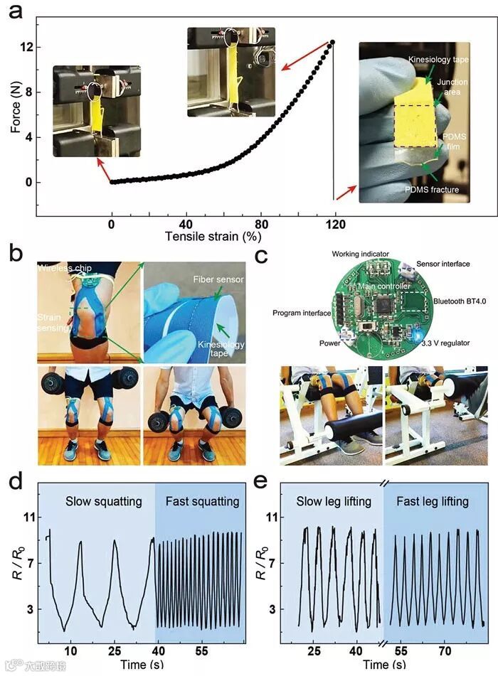 研究团队进一步将该新型柔性纤维状应变传感器编织入织物,并进行实际人体运动检测应用测试。PDMS组分与织物之间存在互锁作用(interlocking effect),使得纤维传感器与织物具有优异的共形性,从而确保检测应力/应变数据的真实。机械性能测试表明在PDMS与织物结合区域,其机械强度要明显高于PDMS柔性器件本身。该柔性可穿戴电子器件能够与人体皮肤实现较好的共性接触,在蹲起、腿部弯曲等人体运动应变检测应用中展现出较高的灵敏度和实用性。
