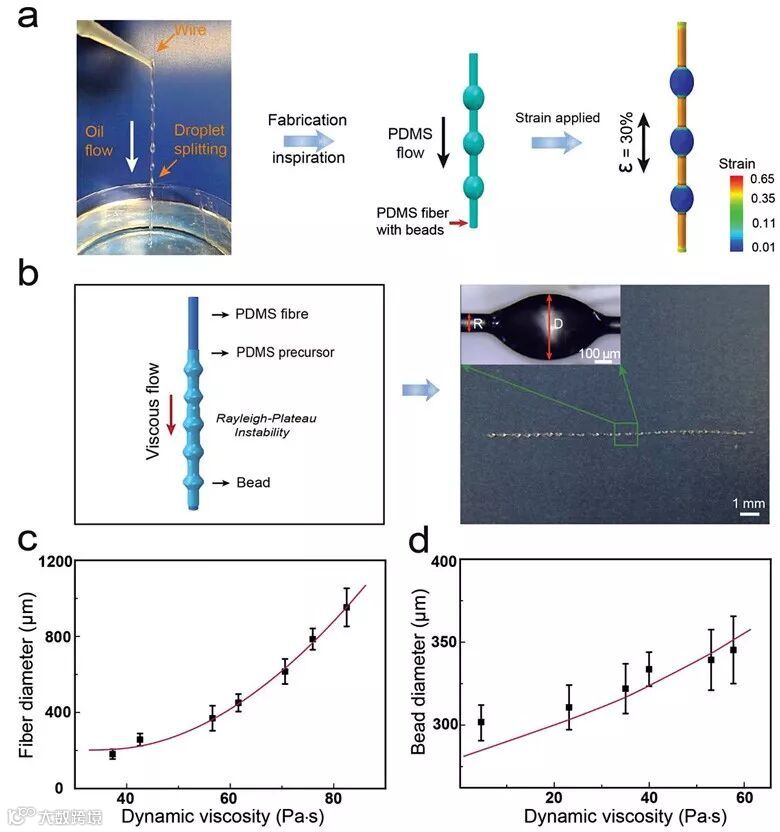 根据能量转换原则,在总体应变恒定的情况下,纤维局部体积的减小能够显著增加该区域应变分布,因此柔性应变传感器的灵敏度能够基于局部应变的放大而显著提高。遵循该设计理念,受油滴流动现象启发,研究团队基于普拉托-瑞利不稳定性结合瞬态热固化技术实现了具有串联微珠状形貌(串珠状)的柔性微纤维的简便、大规模构筑。该柔性纤维其纤维直径以及微珠直径能够通过调节聚二甲基硅氧烷(PDMS)预聚体动态粘度(dynamic viscosity)进行精确调控。