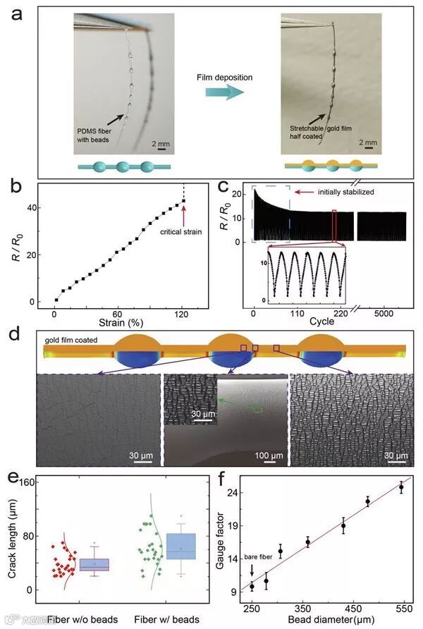 作者在该串珠状纤维表面蒸镀导电金属(Au)构筑柔性应变传感器,其电阻(R/R0)随施加应变的增加而线性增加。施加30%拉伸应变的可逆拉伸循环(5000余次)测试表明,该新型纤维状传感器具有良好的性能稳定性。纤维表面SEM测试表明,纤维轴向方向不同部位拉伸应变产生的裂纹形貌存在着显著差异,体现了纤维表面应变分布的不均一性。同时,该柔性纤维状应变传感器的灵敏度随微珠直径的增大而呈线性增大趋势。