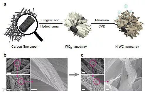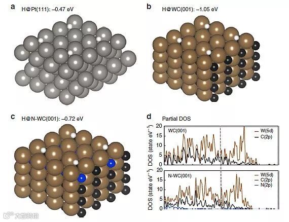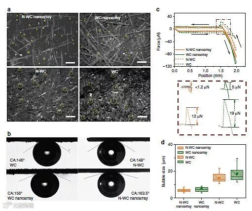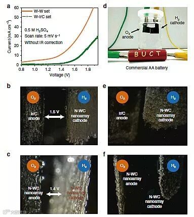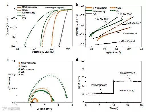 近日,北京化工大学孙晓明教授课题组在Nature Communications 上发表文章,报道了氮掺杂碳化钨纳米阵列材料可以用作双功能催化剂,在0.5 M硫酸溶液中催化水电解,电解的起始电压在1.4 V左右。碳化钨(WC)一直被认为是一种很有前景的非贵金属HER催化剂,但是碳化钨中的钨与氢形成强W-H键,对HER的催化活性不够理想。作者将电子结构调控(氮掺杂)和超疏气界面的构筑(纳米结构设计)相结合,有效促进了WC在酸性体系中催化HER的活性和稳定性。作者通过密度泛函理论计算发现,相比于WC,N-WC表面对H的吸附能更有利于HER反应。而纳米结构的设计、超疏气界面的构筑,不仅有效提高了活性比表面,更促进了气泡从表面的脱离,从而促进了HER反应持续高效地进行。由于气泡在超疏气界面粘附力小,气泡的产生、脱离对电极造成的破坏减小,从而提高了电极工作的稳定性。该文章报道的N-WC nanoarray催化剂可以在-190 mV vs. RHE实现-200 mA/cm2的HER电流密度。该催化剂在-60 mA/cm2左右工作22 h,电流密度仅衰减0.5%左右。