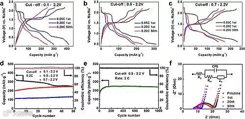 新加坡南洋理工大学的楼雄文教授课题组报道了一种空心结构的Cu1.8S负极材料,通过优化电解液体系和充放电截止电压,表现出优异的循环稳定性,在2 C的电流密度下,能稳定循环1000周。同时,非现场XRD、HRTEM、SAED测试表明,不同于常规硫化物的转化反应,该Cu1.8S材料在0.1-2.2 V电压区间表现出独特的钠离子嵌入/脱出机制。DFT计算结果表明,Cu1.8S材料钠离子扩散的能垒大约为0.51 eV/原子,表明Cu1.8S材料是良好的钠离子导体。