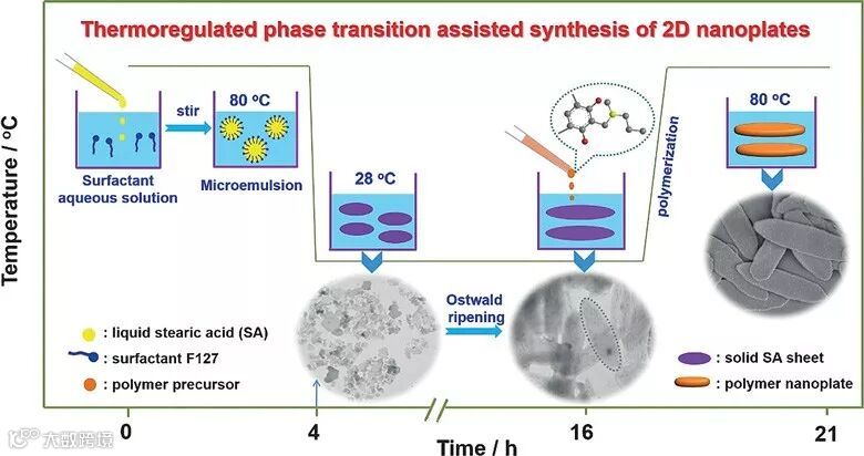 陆安慧团队报道了基于温控相转变的方法合成孔径精准可控的分子筛型纳米炭片,这种纳米炭片sp2杂化碳的含量超过80%,微孔孔径在0.53-0.58 nm范围精准可调,炭片厚度在30-65 nm内精准可控。他们首先将融化的疏水性硬脂酸分散在表面活性剂F127水溶液中,形成均匀的微乳液,随后将该溶液冷却,硬脂酸经历液相、固相及奥斯特瓦尔德熟化,最终形成硬脂酸纳米片溶胶液,接下来通过氢键作用,诱导间苯二酚/甲醛/丙胺在硬脂酸薄片周围进行界面组装和聚合。在随后的高温热解过程中,超薄结构促进了碳微晶体的定向生长,并且由于薄层结构的导向作用,碳微晶趋向于平行排布,最终形成均匀的超微孔炭。