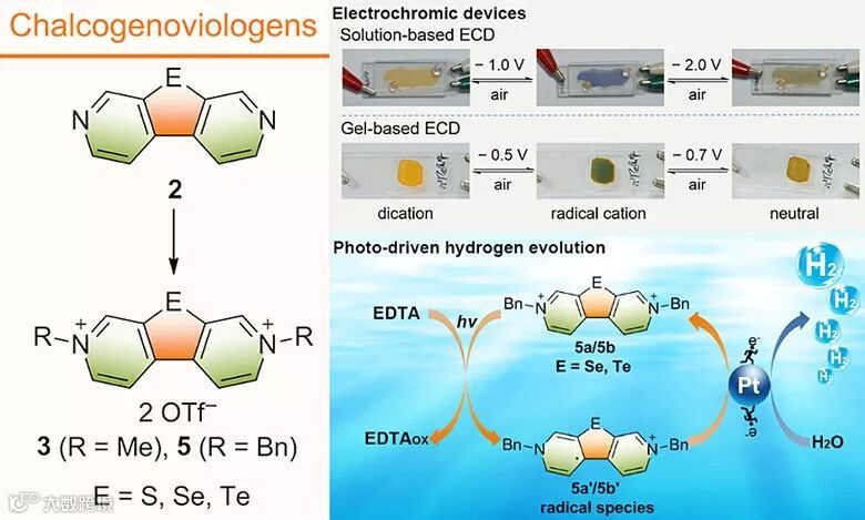 基于上述的考虑,该课题组近期将硫族元素(S、Se、Te)引入紫罗精骨架中,成功制备了含硫族元素的紫罗精小分子衍生物,并将其命名为“Chalcogenoviologens”。研究发现,含硫族元素的紫罗精具有以下特性:(1)更刚性的骨架;(2)多个氧化还原中心,表现出非常丰富的电化学行为;(3)在保持很低LUMO能级的同时,极大地降低了体系的能隙(能隙降低至2.33 eV),光学吸收红移至可见光区(最大吸收波长达到491 nm)。含硫族元素的紫罗精成功应用于电致变色器件,表现出三种颜色的变化,同时基于电致变色器件原位监测其光谱电化学的特性为后续的深入研究奠定了基础。另外,含硫族元素的紫罗精在可见光催化的析氢反应中也表现出优异的性能,可同时作为光敏剂和电子转移剂,不仅大大简化了可见光催化析氢反应,而且还大幅度提高了可见光催化的效率。尤其是硒联紫罗精,由于具有特殊的能级结构,电子转移及转化成自由基的速率快,导致其析氢速率比碲联紫罗精快五倍以上。以上研究结果以论文的形式发表在Angewandte Chemie International Edition 上,西安交通大学前沿院的博士生李国平为论文的第一作者,西安交通大学前沿院为唯一通讯作者单位。这也是何刚教授课题组继2017年(Angew. Chem. Int. Ed., 2017, 56, 15334)之后在含硫族元素杂环芳香烃领域研究的又一重要突破。