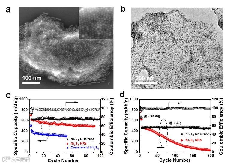 (a) Ni3S4 NRs的SEM成像;(b) Ni3S4 NRs/rGO复合材料的TEM成像;(c, d) Ni3S4 NRs/rGO复合材料在0.05 A/g和1 A/g下的循环性能图。