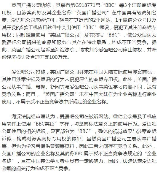 近日,北京市海淀区人民法院(下称海淀法院)就英国广播公司(BBC)起诉北京爱语吧科技有限公司(下称爱语吧公司)侵犯商标权及不正当竞争纠纷案作出一审判决,认定爱语吧公司擅自使用“BBC”标识的行为构成商标侵权及不正当竞争,判决爱语吧公司停止侵权行为,并赔偿英国广播公司经济损失及合理开支共计100万元。