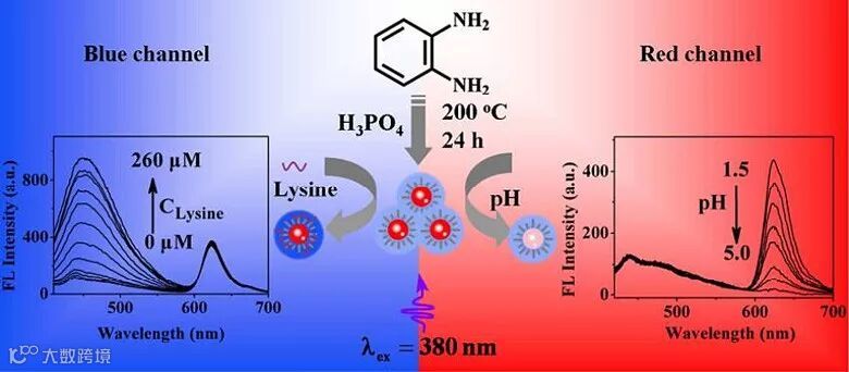图1. 双发射碳点的制备及其比率检测pH和赖氨酸的示意图