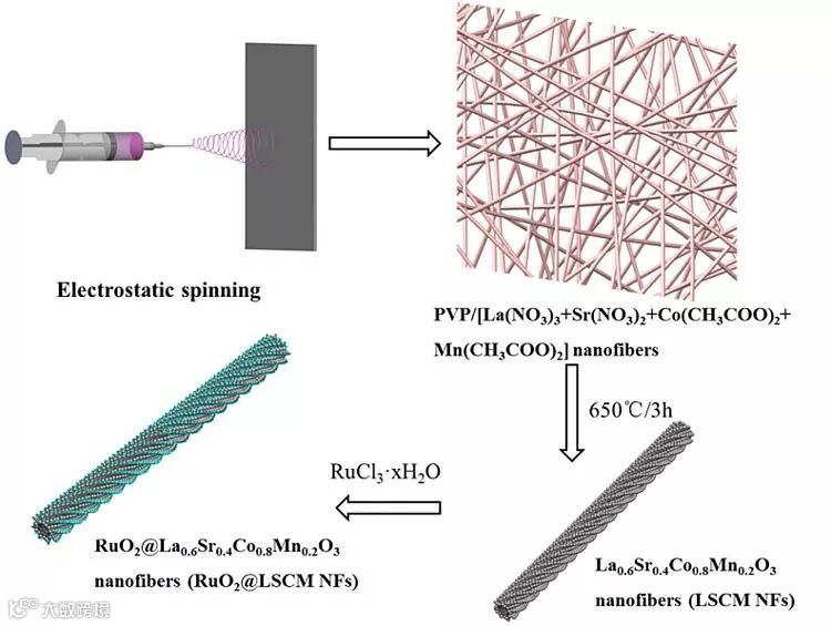 图1. LSCM NFs和RuO2@LSCM NFs的合成过程示意图。