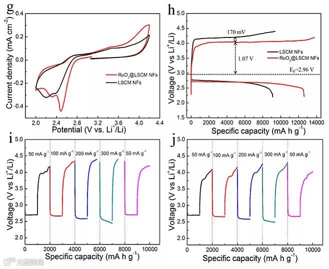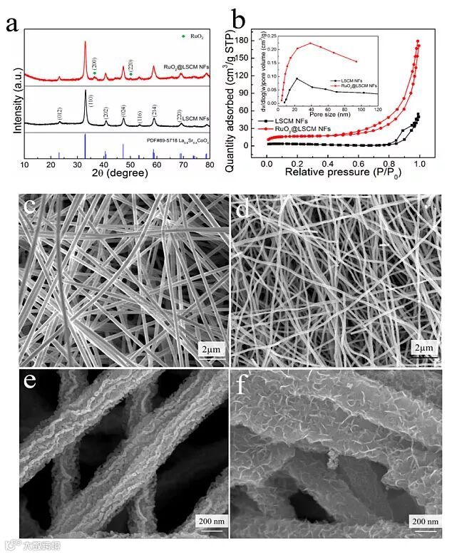 图2. (a)LSCM和RuO2@LSCM纳米纤维的XRD图谱;(b)氮气吸脱附等温线和孔尺寸分布;(c-f)样品的扫描电镜照片:(c)刚电纺制备的样品,(d,e)在650 ℃焙烧后的LSCM纳米纤维,(f)RuO2@LSCM纳米纤维;(g)LSCM和负载RuO2纳米片的LSCM纳米纤维催化剂组装的Li-O2电池的循环伏安曲线,电位窗口2.0-4.2 V (vs. Li+/Li ),扫描速率1 mV s-1,(h)两种不同催化剂组装的Li-O2电池的放电/充电曲线,电流密度为50 mA g-1;(i, j)两种不同催化剂组装的Li-O2 电池在不同电流密度下的放电/充电曲线,容量限制在1000 mA h g-1。