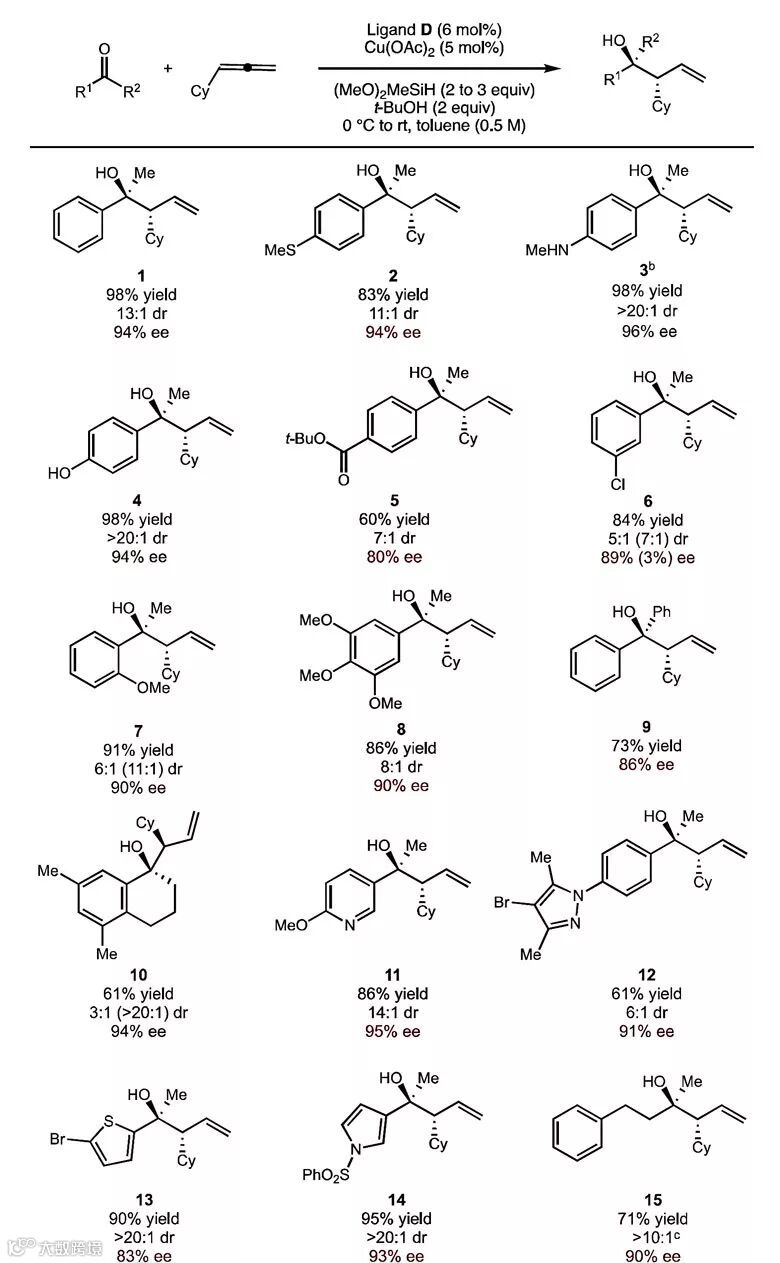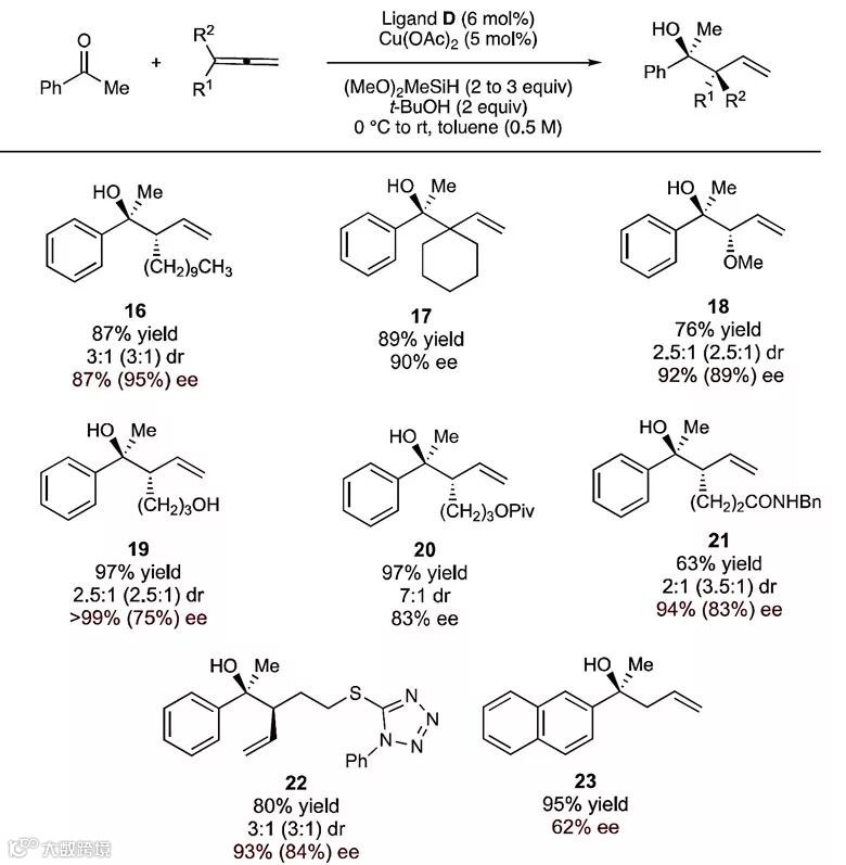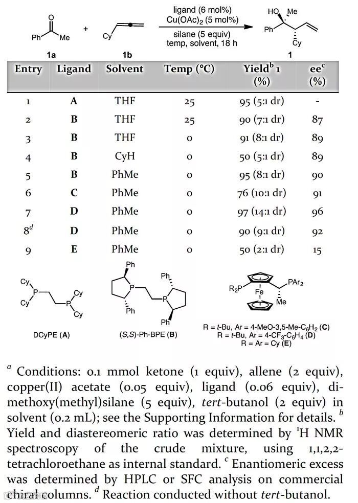 作者首先以苯乙酮1a与环己基联烯1b作为模板底物对反应条件进行筛选,考察不同配体、溶剂、反应温度等条件对结果的影响。研究发现,当使用Josiphos型膦配体D,甲苯作为溶剂,反应在0 ℃条件下能以97%的1H NMR收率、14:1的非对映选择性、96%的对映选择性得到高烯丙醇产物1。