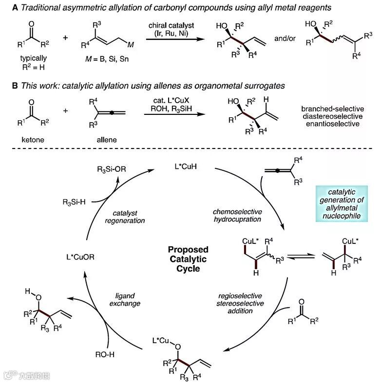 Stephen Buchwald教授发展了CuH催化的末端联烯对酮的不对称烯丙基化反应。反应可以在温和的条件下进行,具有良好的收率与立体选择性,官能团兼容性好。作者还利用31P NMR跟踪反应中可能经历的中间体,从而验证了提出的机理,并确定了反应的决速步。