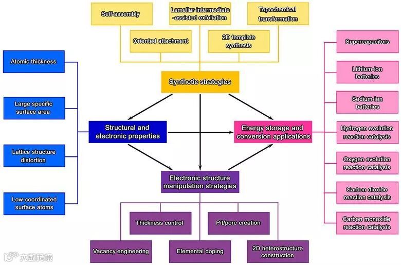 图2. 超薄二维非层状晶体材料的制备方法、电子结构特性、电子结构调控手段及能量存储与转换的应用