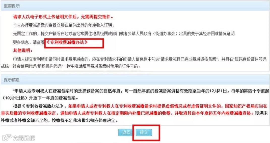 6.页面展示出费减备案享受的权利以及重要提示,此页信息提交成功后可以在查看页面打印,点击“提交”。