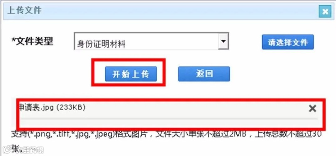 选中的图片被加在到上传文件列表中,点击“开始上传”。