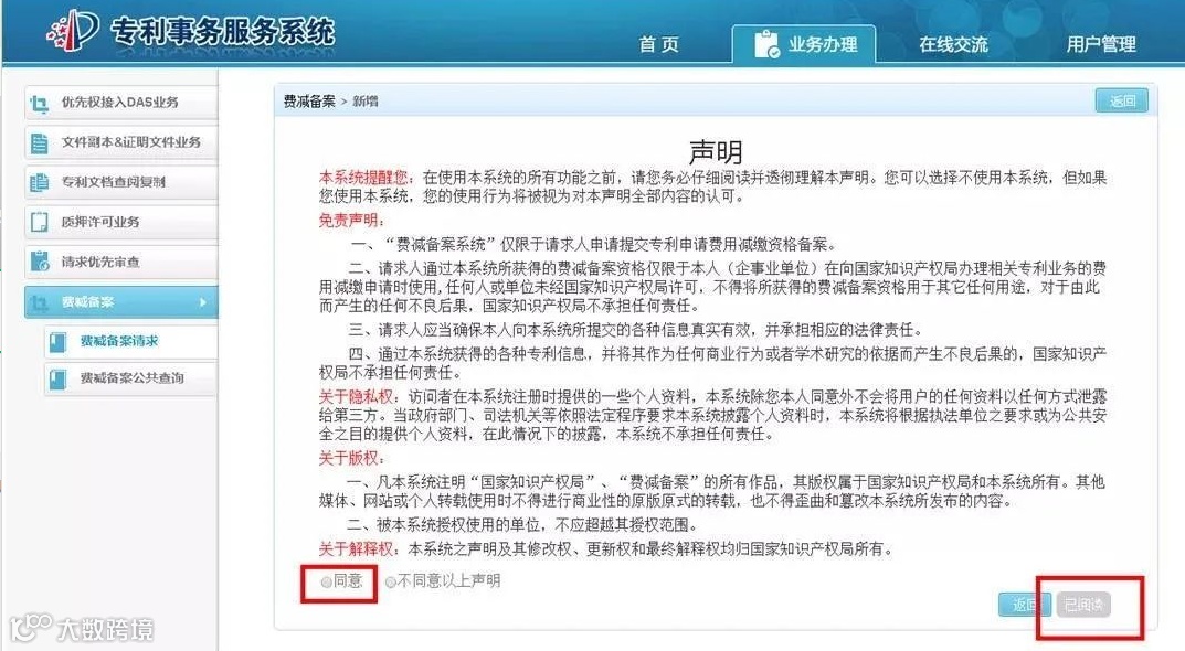 3.进入声明页面,选择“同意”,点击“已阅读”按钮,进入新增费减备案申请页面。