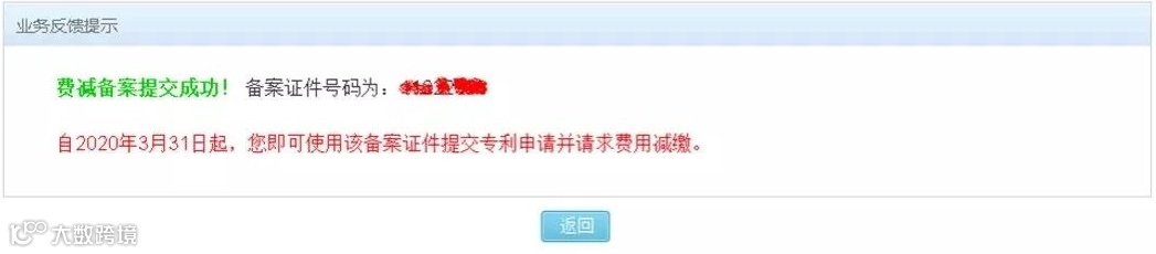 7.确认提交后会展示系统回执,费减备案请求提交成功。