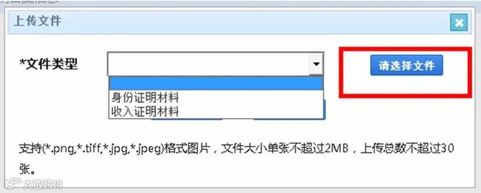 点击“附件信息”处的“上传文件”,在弹出的对话框中选择“文件类型”,点击“请选择文件”,在弹出的对话框中添加相应的图片文件。