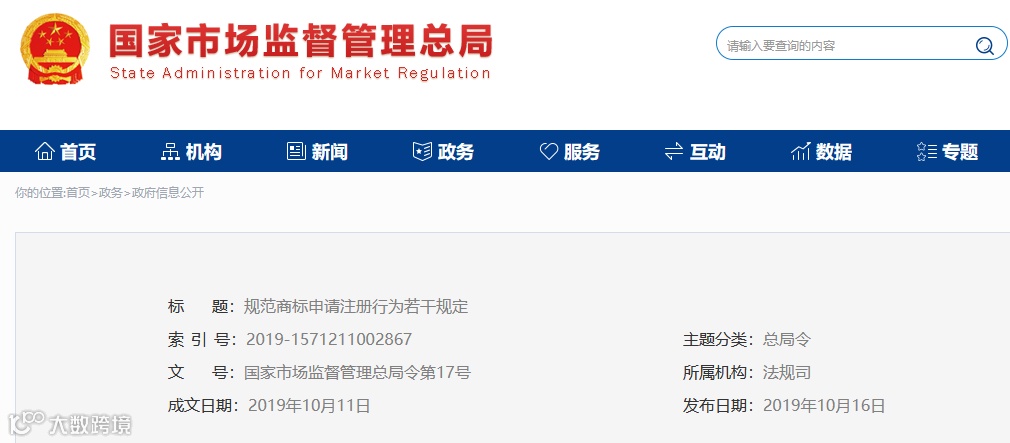 《规范商标申请注册行为若干规定》已于2019年10月10日经国家市场监督管理总局2019年第13次局务会议审议通过,现予公布,自2019年12月1日起施行。