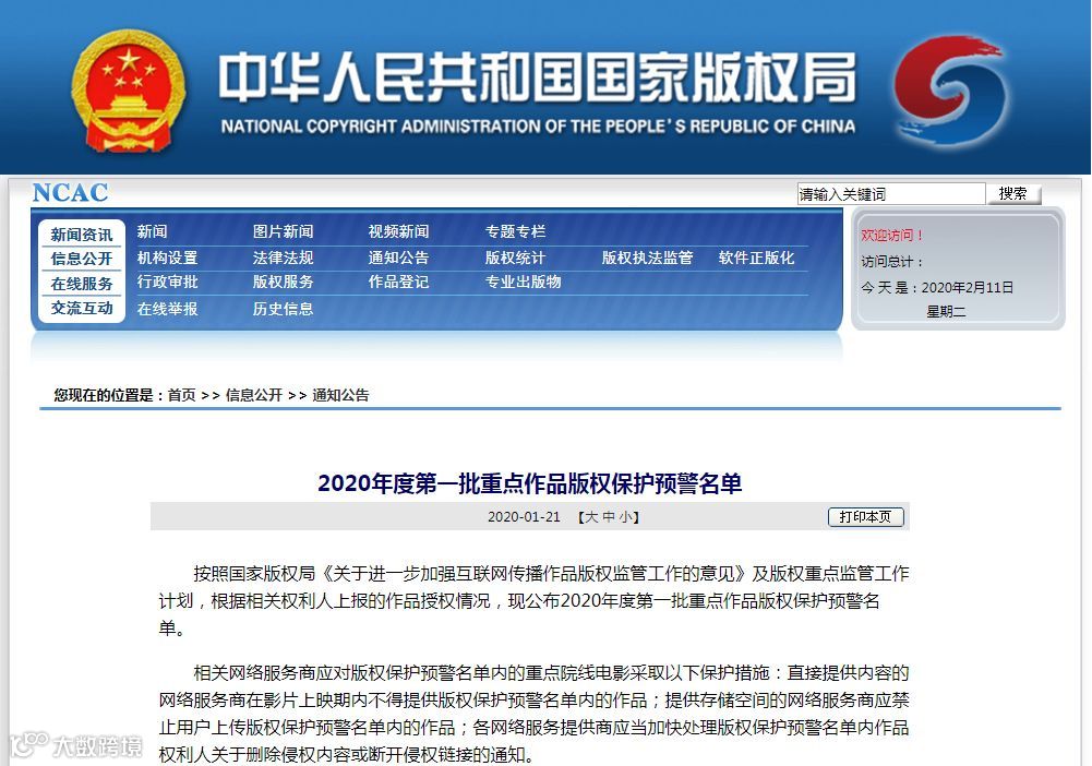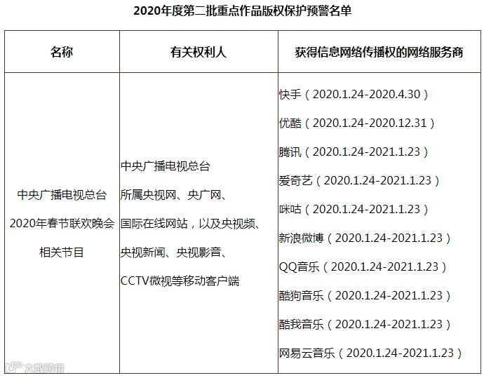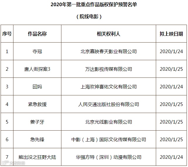 按照国家版权局《关于进一步加强互联网传播作品版权监管工作的意见》及版权重点监管工作计划,根据相关权利人上报的作品授权情况,现公布2020年度第一批重点作品版权保护预警名单。