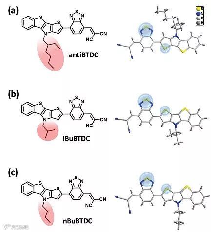 三种小分子给体antiBTDC、iBuBTDC、nBuBTDC(图1,其中antiBTDC的结构在作者团队之前的工作中已经报道过),结构区别仅在于具有不同的侧链:antiBTDC侧链为2-乙基己基,iBuBTDC侧链为异丁基,nBuBTDC的侧链为正丁基。不同的侧链烷基链的长度,对于分子结晶影响很大,较短的有利于结晶,但是溶解性会变差,不利于化学提纯。