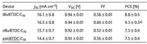 总之,研究者分析了侧链长度对于D-A-A型蒸镀小分子给体的薄膜特性及光伏性能的影响,发现在薄膜中不同侧链分子的π-π堆积距离其实并不相同,拥有更短烷基链的iBuBTDC的晶体堆积密度会更高,从而形成更大的薄膜密度。iBuBTDC也展现除了更大的面外π-π堆积排列,这有助于分子间的电荷传输,从而导致更大的短路电流及填充因子,所以基于此材料的器件效率可以接近10%。本论文进一步论证了分子设计中不同烷基侧链对于吸收、形貌等的影响,在后续材料设计中,通过引入不同烷基链来进行性能微调应该会成为常见的策略。