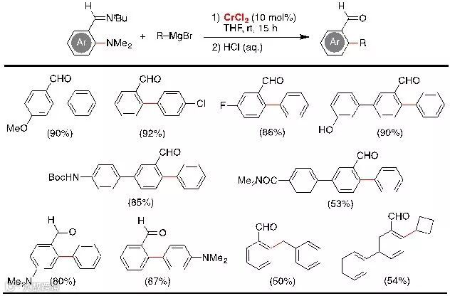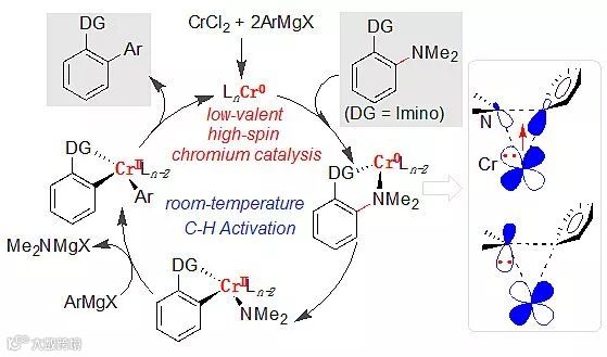 四川大学化学学院的曾小明课题组最近致力于以廉价简单的铬盐为前体,开发低价态的铬催化合成化学新策略。在前期研究低价铬催化惰性碳-氧和碳-氢键的区域选择性功能转化基础上(JACS, 2015, 137, 14367; Organometallics, 2016, 35, 747; Synlett, 2017, 28, 2577),他们认为在格氏试剂的双电子还原作用下,二价的铬盐原位被还原为零价态金属铬物种;通过邻位亚胺基团的螯合协助作用,低价铬易于与胺基配位,进而与碳-氮键发生氧化加成断裂并实现这类惰性化学键的Kumada偶联转化。在无外加配体的条件下,他们发现以催化剂量的二氯化铬就能实现催化断裂惰性碳-氮键,使其与格氏试剂发生交叉偶联反应,室温合成邻芳基或烷基取代的苯甲醛衍生物。该铬催化的合成策略表现出高度的区域与化学选择性,仅邻位碳-氮键被选择性地断裂与功能转化,能有效地保留苯环其它区域的碳-氮和碳-氧键,反应体系兼容氟、氯、酰胺和酯等官能团。机理实验表明在格氏试剂作用下,二价态铬盐通过双电子还原生成具有催化活性的零价铬,继而实现了碳-氮键的断裂与功能转化;动力学实验结果说明该反应的初始速率与苯胺底物的浓度存在逆一级反应速率关系,暗示在催化循环外底物有可能与低价铬物种形成了稳态、非活性的络合物中间体;Hammett曲线研究结果表明处于缺电芳环上的碳-氮键更容易发生断裂与偶联转化。