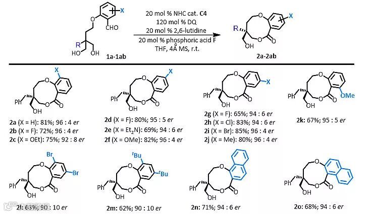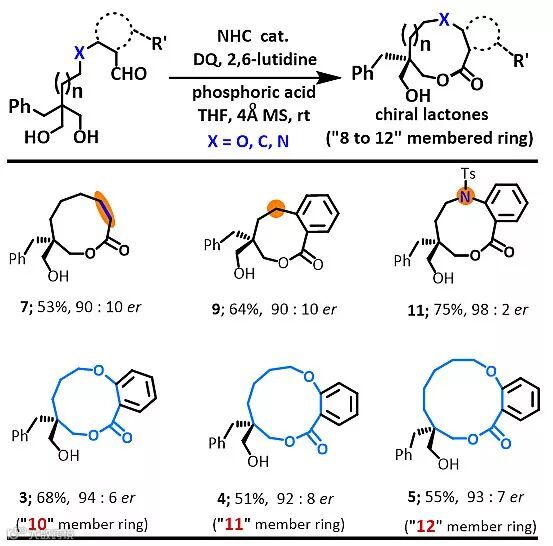 上述局限性表明,人们需要寻找一种能够更好地满足原子经济性和步骤经济性、且能够在酯化环化过程中实现立体控制的催化方法来实现中环内酯的对映选择性合成。清华大学药学院的汪舰教授课题组长期致力于氮杂卡宾作为有机分子催化剂用于各类杂环骨架不对称合成的研究,由此发展了一系列全新的合成方法学。基于以上对内酯构建策略的思考,在前期研究的基础上,他们设计通过手性氮杂卡宾与底物形成具有一定立体化学环境的酰基卡宾中间体结构,诱导分子内1,3-二醇去对称化醇解反应的发生,从而实现中环内酯的对映选择性合成。在反应条件优化的过程中,他们还发现利用手性氮杂卡宾和磷酸共催化的体系能够更好地实现反应对映选择性的控制。值得注意的是,该催化反应成功地构建了一个手性季碳。良好的底物适用性、优异的对映体选择性以及温和的反应条件为中环内酯的不对称合成提供了简洁的途径。