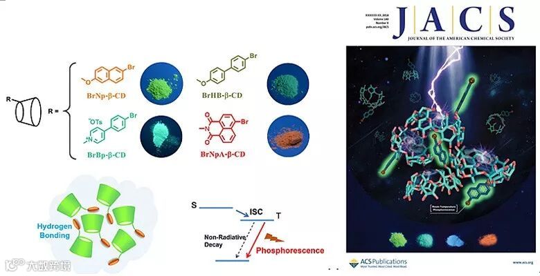 传统的室温磷光材料大多为含贵金属元素的无机或者金属有机配合物,价格昂贵且毒性较大,因此急需发展制备纯有机室温磷光材料来替代。鉴于有机分子的激发三线态能量很容易通过热力学振动与碰撞过程或暴露接触到猝灭因子如氧气而失活,因而纯有机材料很难产生高效的室温磷光发射。目前有机室温磷光体系的构建大多是基于高度有序的晶态或刚性基质包埋材料,其制备过程不便且不易重复,限制了该类材料的发展。该研究工作中,研究团队通过将有机重原子磷光染料基团修饰到β-环糊精上,非常便捷地制备了一系列具有高效室温磷光发射的无定形态有机小分子化合物。这类无定形固态的环糊精衍生物间的氢键环境既能固定磷光团来抑制其非辐射弛豫,也能将磷光团与外界猝灭物质相隔离,从而确保分子能实现高效的室温磷光发射。同时,由于环糊精自身拥有能够选择性地包结芳香化合物的较大疏水空腔,他们还选择利用其中一个环糊精主体衍生物与荧光客体分子在水中进行预组装来共建超分子体系,制备出了具有磷光-荧光共发射且多色发光(包括白光发射)可调控性质的包合物材料。该研究成果首次报道了无定形态纯有机小分子室温磷光材料,制备方法新颖、简便且通用,受到了期刊编辑和审稿人的高度评价(Top 5%),并被选为期刊封面报道。