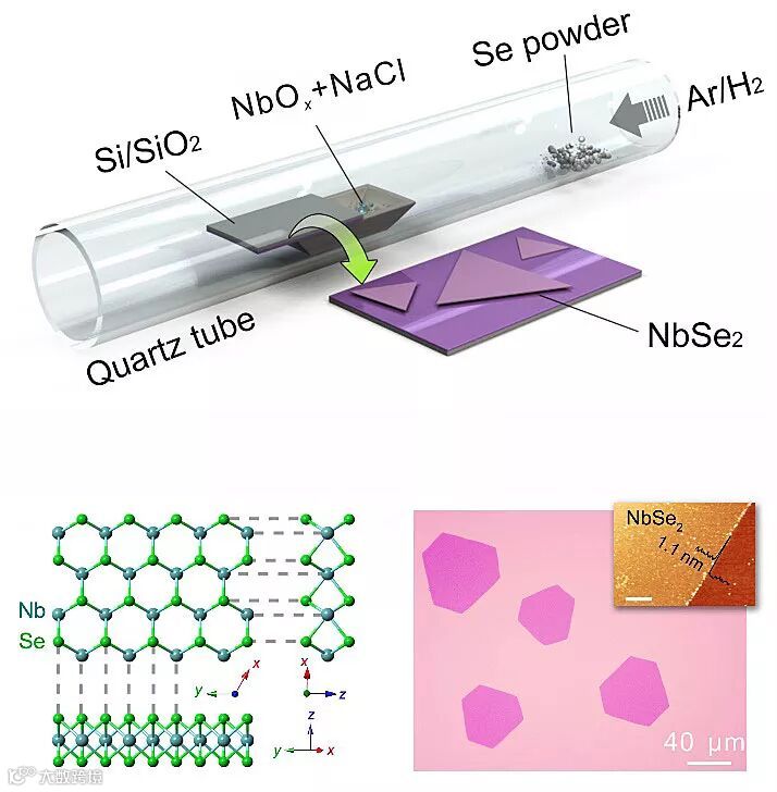 单层NbSe2的合成示意图、原子结构及光学显微镜成像。图片来源:Nat. Commun.
