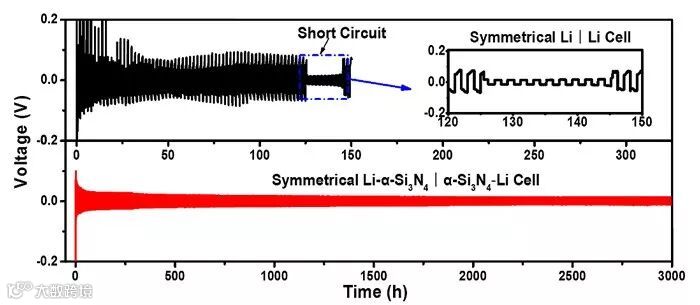 图3. 对称Li | Li电池和Li-α-Si3N4 |α-Si3N4-Li电池的电压-时间曲线