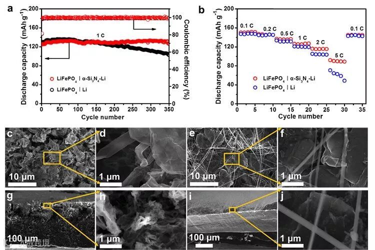 图4. LiFePO4 | Li电池中引入α-Si3N4亚微米线膜和未引入α-Si3N4亚微米线膜电化学性能的对比及对应锂负极的形貌