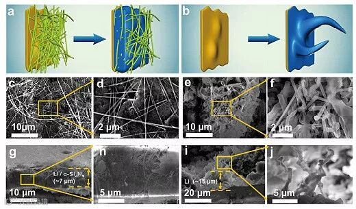 图2. Li在覆盖α-Si3N4膜铜集流体(a, c, d, g, h)和商用铜集流体(b, e, f, i, j)上的沉积形貌