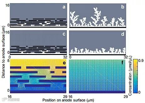 图1. Li在多孔介质(a, c, e)和非多孔介质(b, d, f)中的生长模拟